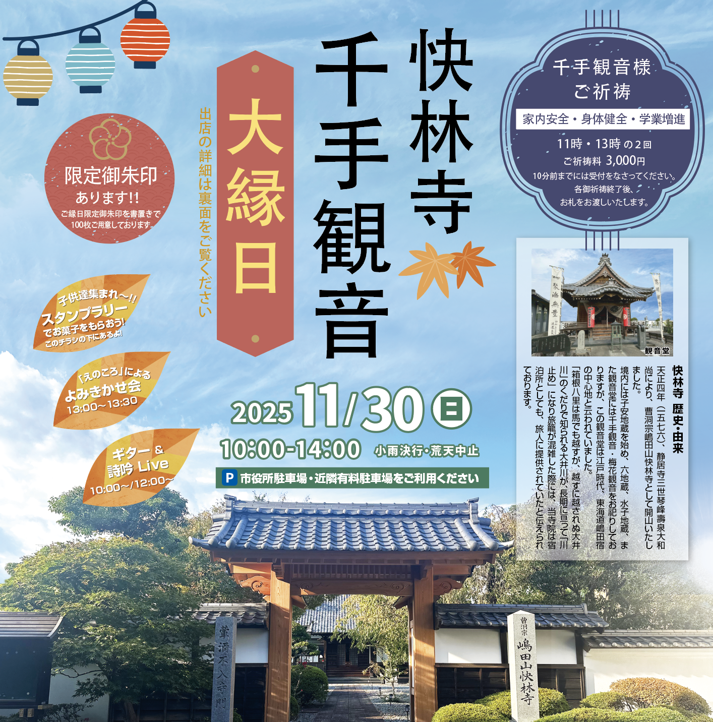 ご家族そろって楽しめるイベントがいっぱい!晩秋の穏やかな1日を快林寺境内でお過ごしください。 |
